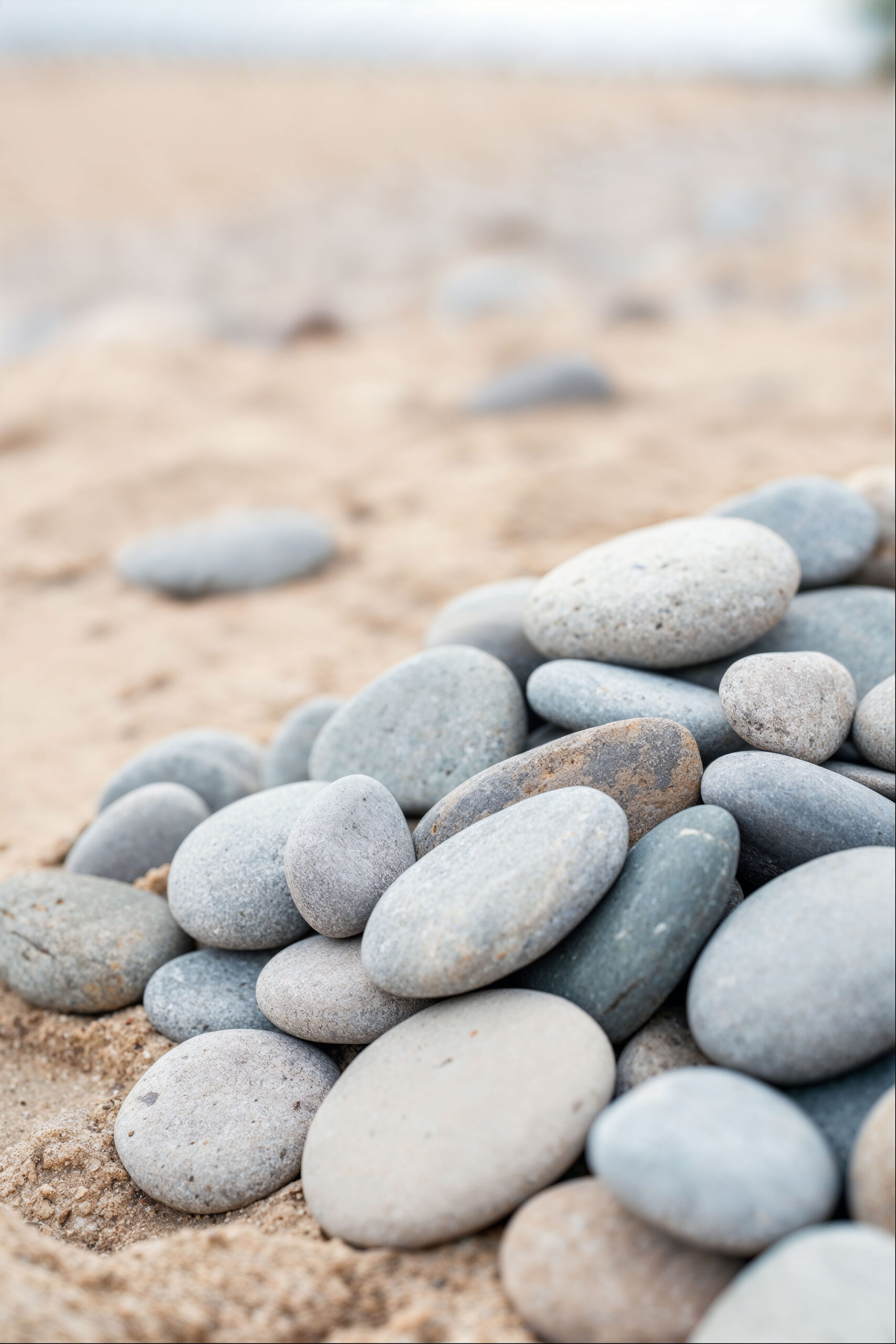 A stack of smooth stones artfully balanced by a waterside, evoking tranquility and zen.